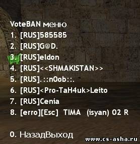 amxx_voteban_delaytime "значение в секундах" -- Время между голосованиями (от голосования каждые 20 секунд идиотами) По стандарту стоит 600 секунд. amxx_voteban_ratio "0.75" -- Необходимое процентное соотношение проголосовавших. По стандарту 0.50 (=50%) amxx_voteban_minvoters "0.0" -- Минимум игроков для начала голосования. Стандартно - пофигу=0.0 amxx_voteban_bantime "20" -- Время бана по голосованию amxx_voteban_type "0" (0- банить по steam_id; 1-банить по ip; 2-банить через amxbans) amxx_voteban_bf_ratio "0.0" -- это процентное соотношение проголосовавших, при котором инициатора голосования будет банить. То есть если какой то дурак беспричинно затевает голосование, то при низком значении голосов "ЗА", этого дурня самого и забанит.
