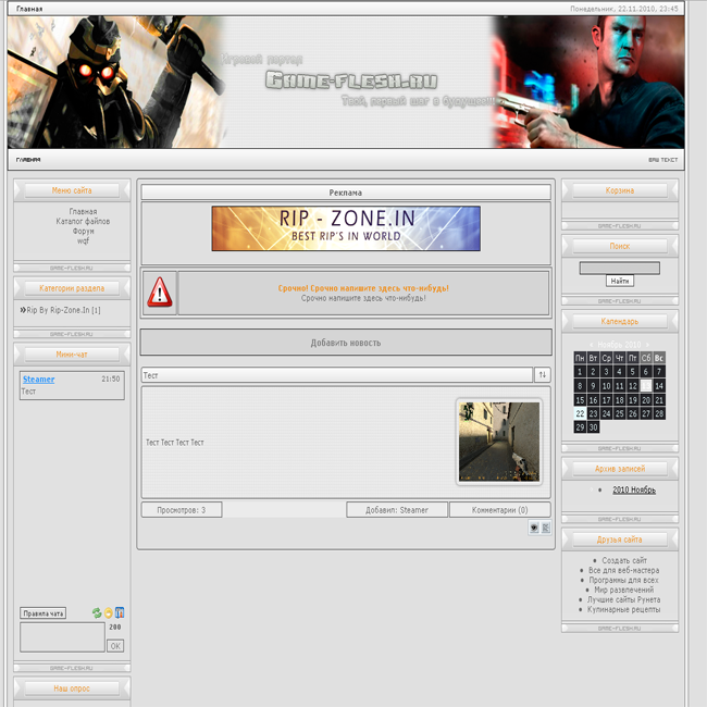 RIP шаблона сайта game-flesh.ru для ucoz. Автор рипа: 4yIIuk. Дизайн разработан для сайтов игровой тематики, у шаблона рабочий конструктор. В архиве есть несколько дополнений к шаблону.